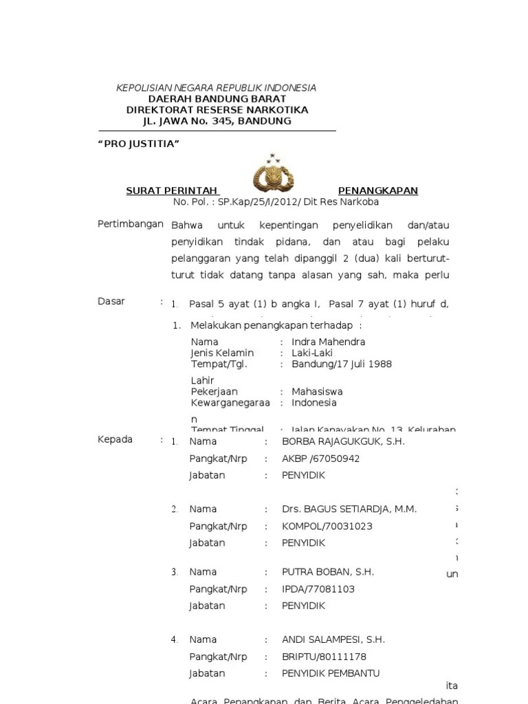 Penangkapan dan surat perintah tugas. 2) penyidik membuat surat pemberitahuan penahanan tersangka kepada . Kepolisian negara republik indonesia kapana daerah bandung barat direktorat reserse narkotika jl. 2.surat perintah penangkapan dengan nomor . Lp i l8 i vi i 2013 /papua/ res peg bintang' tanggal 16 juni 2013'. Kepolisian negara republik indonesia daerah jawa tengah resor magelang kota surat perintah penahanan no. Menempatkan tersangka di rumah tahanan negara polisi daerah bali di jl. 2 tahun 2002 tentang kepolisian negara ri. Berita acara serah terima tersangka / saksi dari polri kepada ppns. Memungkinkan diadakan penangkapan, penahanan, penggeledahan. Surat pemberitahuan perkembangan hasil penyidikan. Surat pemberitahuan penahanan kepada keluarga tersangka;. Sebagai contoh, jika dalam surat dakwaan berisi. Pidana agar penyidik kepolisian negara republik.